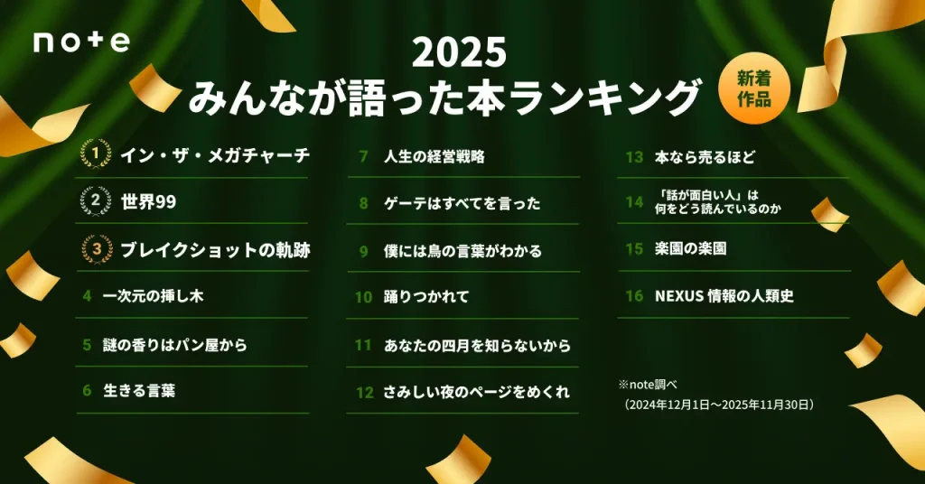 note株式会社は、note上に投稿された読書感想文をもとに集計した「みんなが語った本ランキング2025」を発表した。